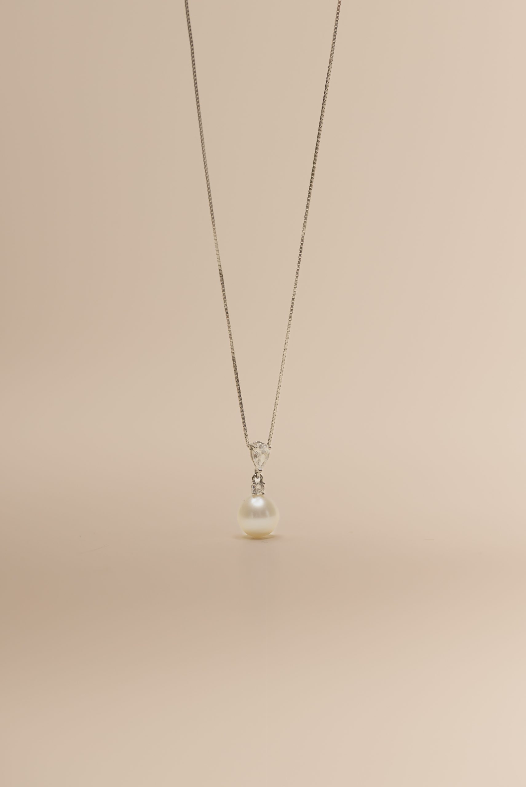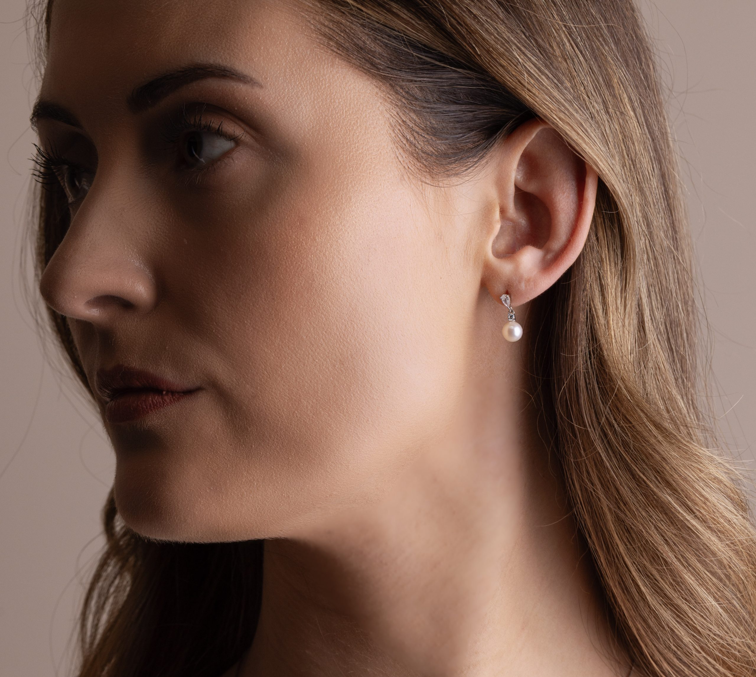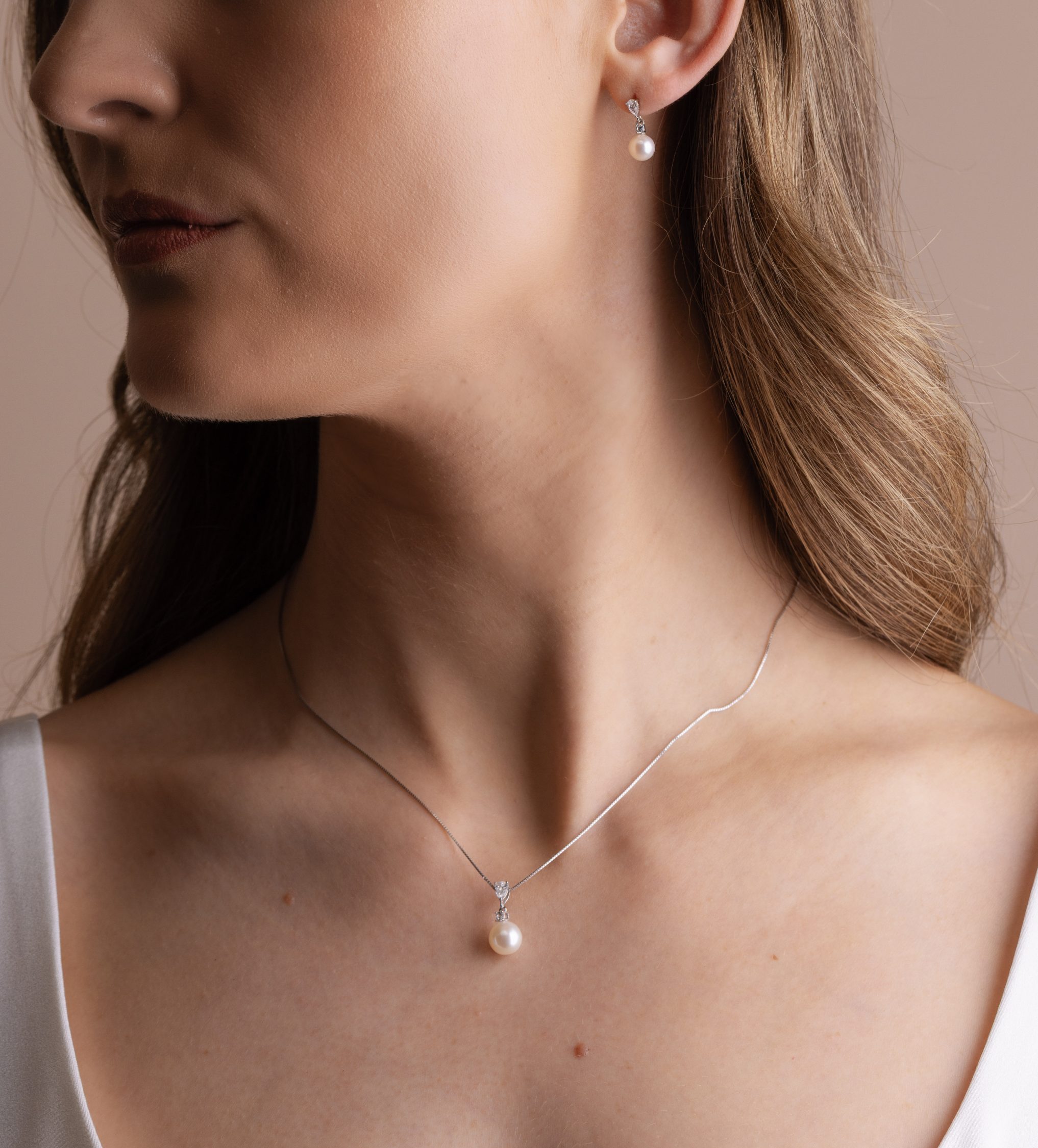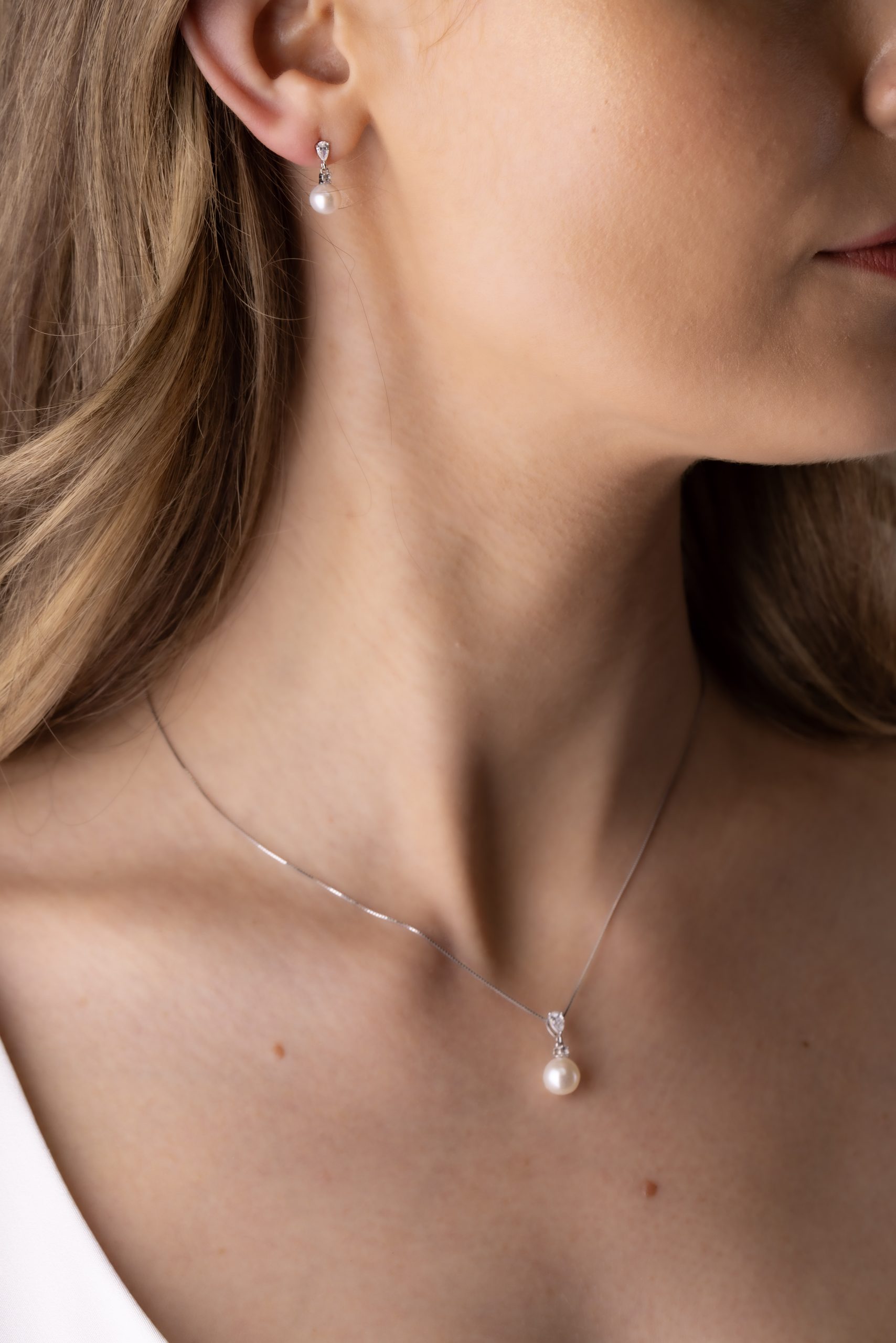 Description: The Melbourne Necklace and Earring Set is a timeless blend of elegance and modern simplicity, crafted in 925 sterling silver with luminous natural freshwater pearls. Each piece features a pearl delicately suspended beneath sparkling round and teardrop cubic zirconia stones, adding subtle brilliance that enhances the pearl’s soft lustre. The fine silver chain, adjustable between 7.5–8.5 inches, holds a pendant designed to complement the matching drop earrings, which secure comfortably with stud fastenings. Refined yet versatile, this set beautifully flatters a variety of bridal necklines including halter, boatneck, scoop, strapless, sweetheart, and V-neck, making it a perfect choice for brides seeking understated sophistication.