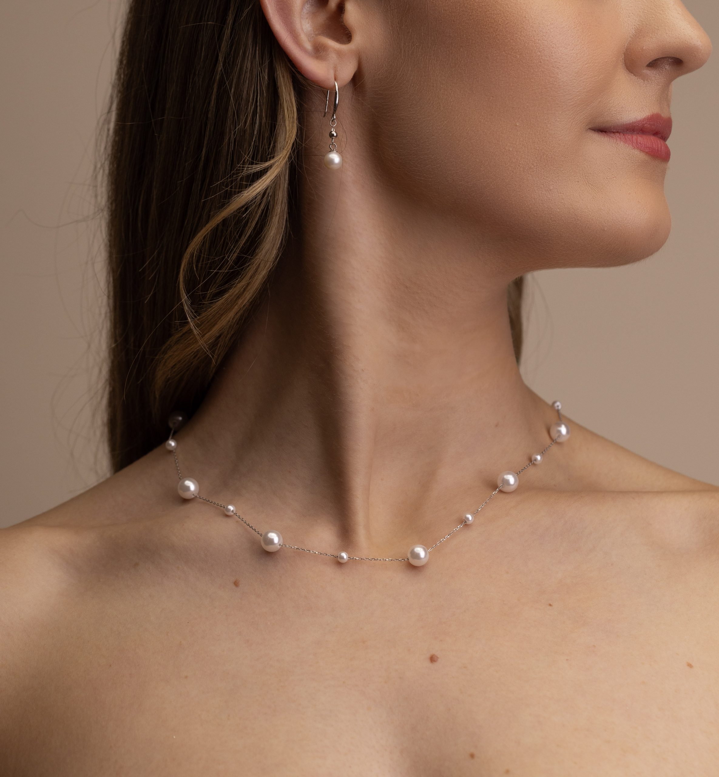 This striking piece features 11 large perfectly round man-made pearls and 10 smaller man-made pearls, carefully arranged in an alternating pattern along a sleek silver chain. While natural pearls vary in shape, we chose man-made pearls for this design to ensure a flawless, uniform silhouette, while still capturing the same natural lustre and radiance as real pearls. The result is a necklace that feels timeless yet fashion-forward, making it an ideal choice for brides who want a polished, modern pearl piece, or for anyone seeking a versatile accessory that elevates both daytime and evening looks.