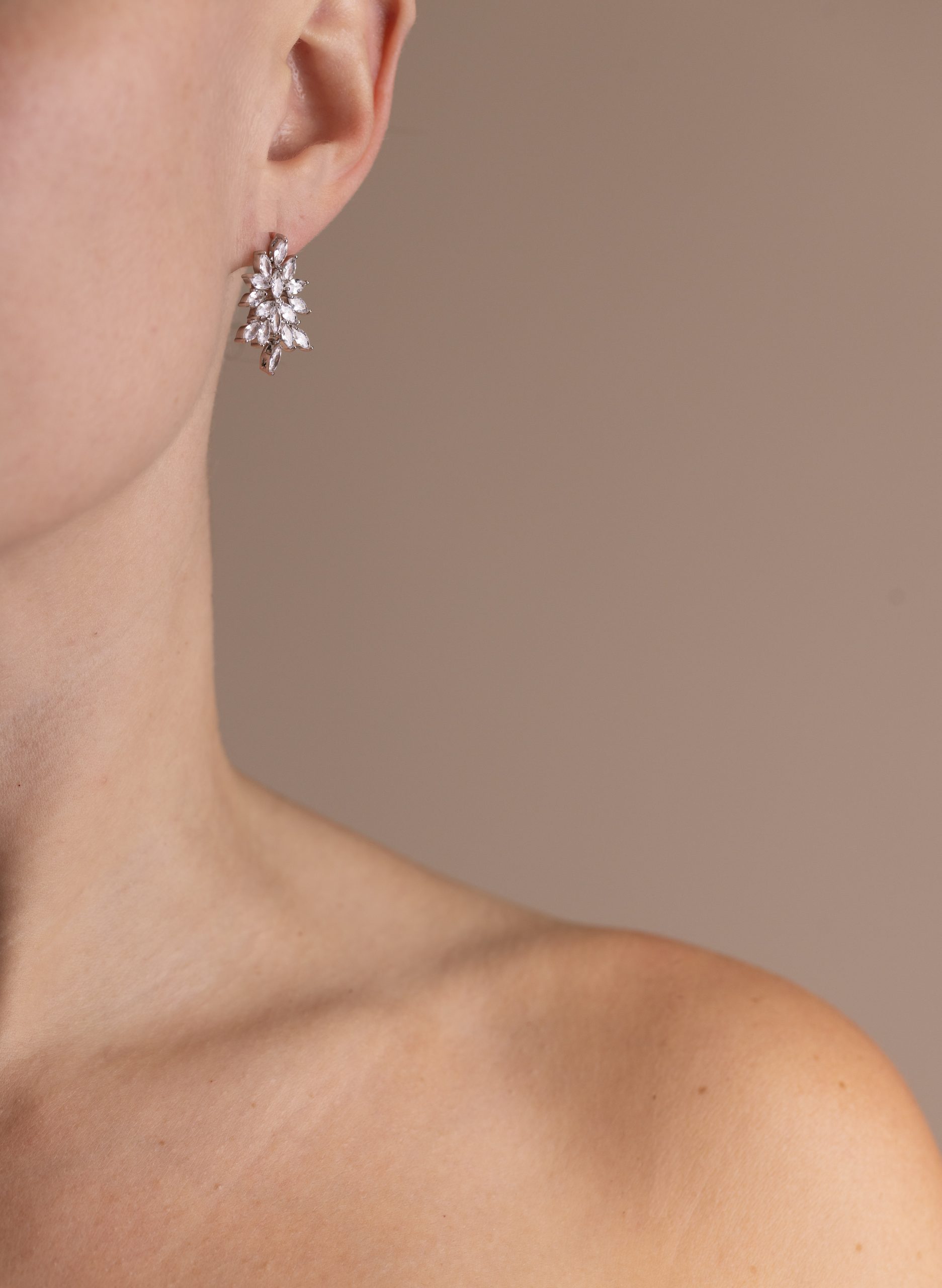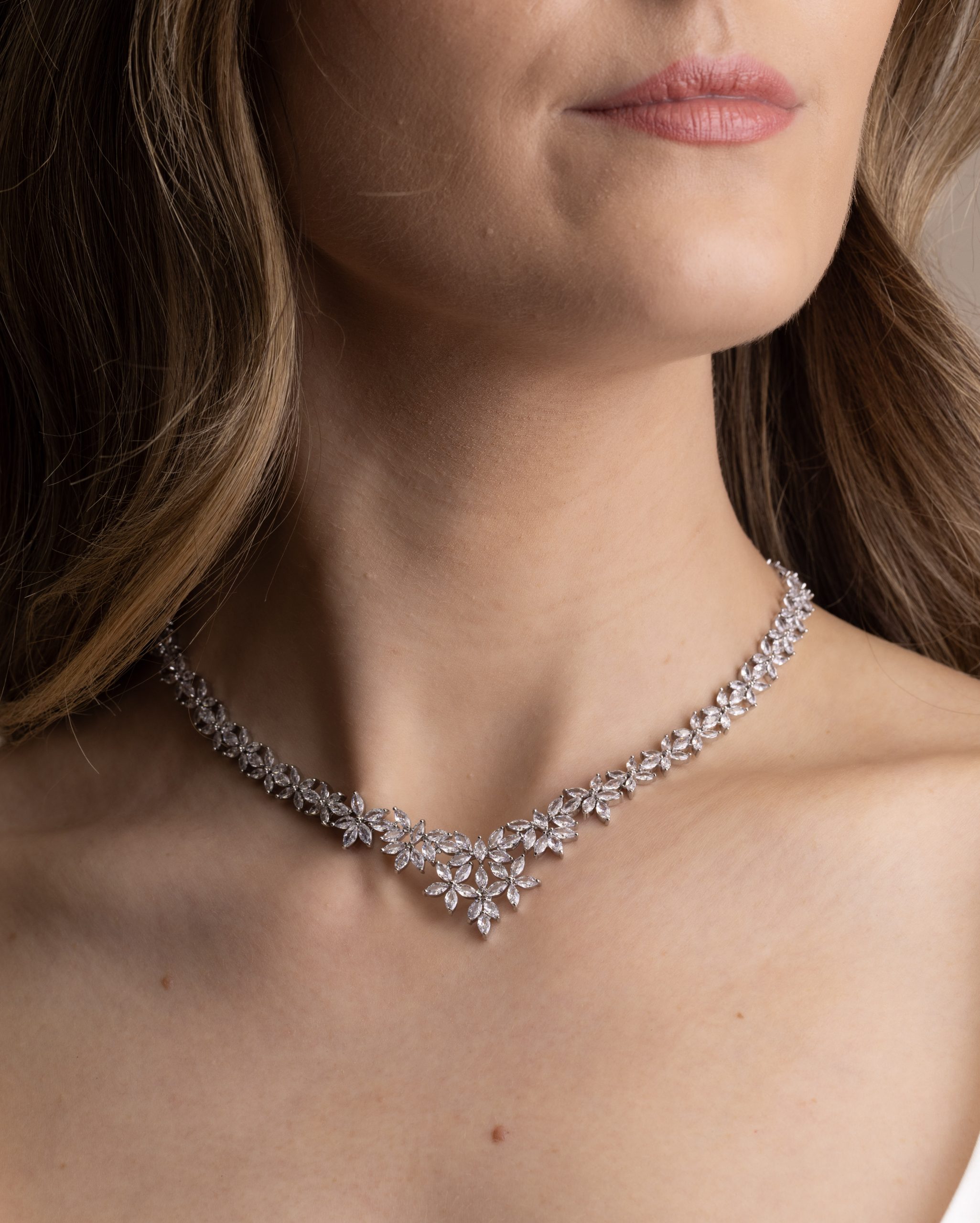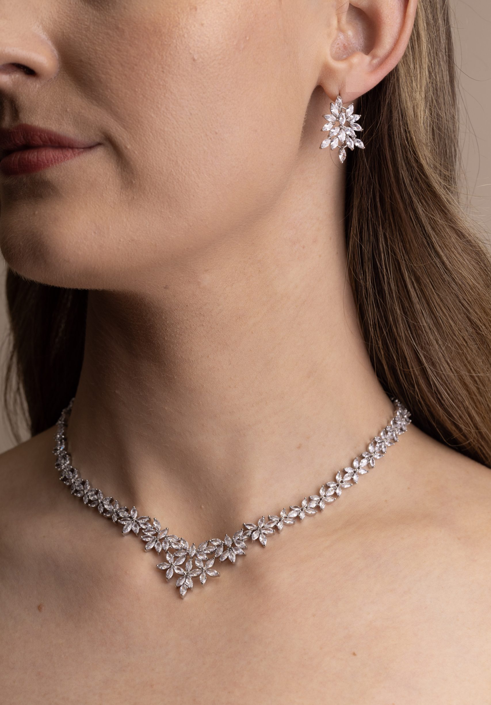 Necklace: The necklace mirrors the floral theme with a continuous line of small, connected blossoms. Each flower is crafted from multiple marquise shaped stones, linked seamlessly to create a graceful, flowing design. At the centre, a slightly larger floral cluster serves as the focal point, enhancing the overall elegance.