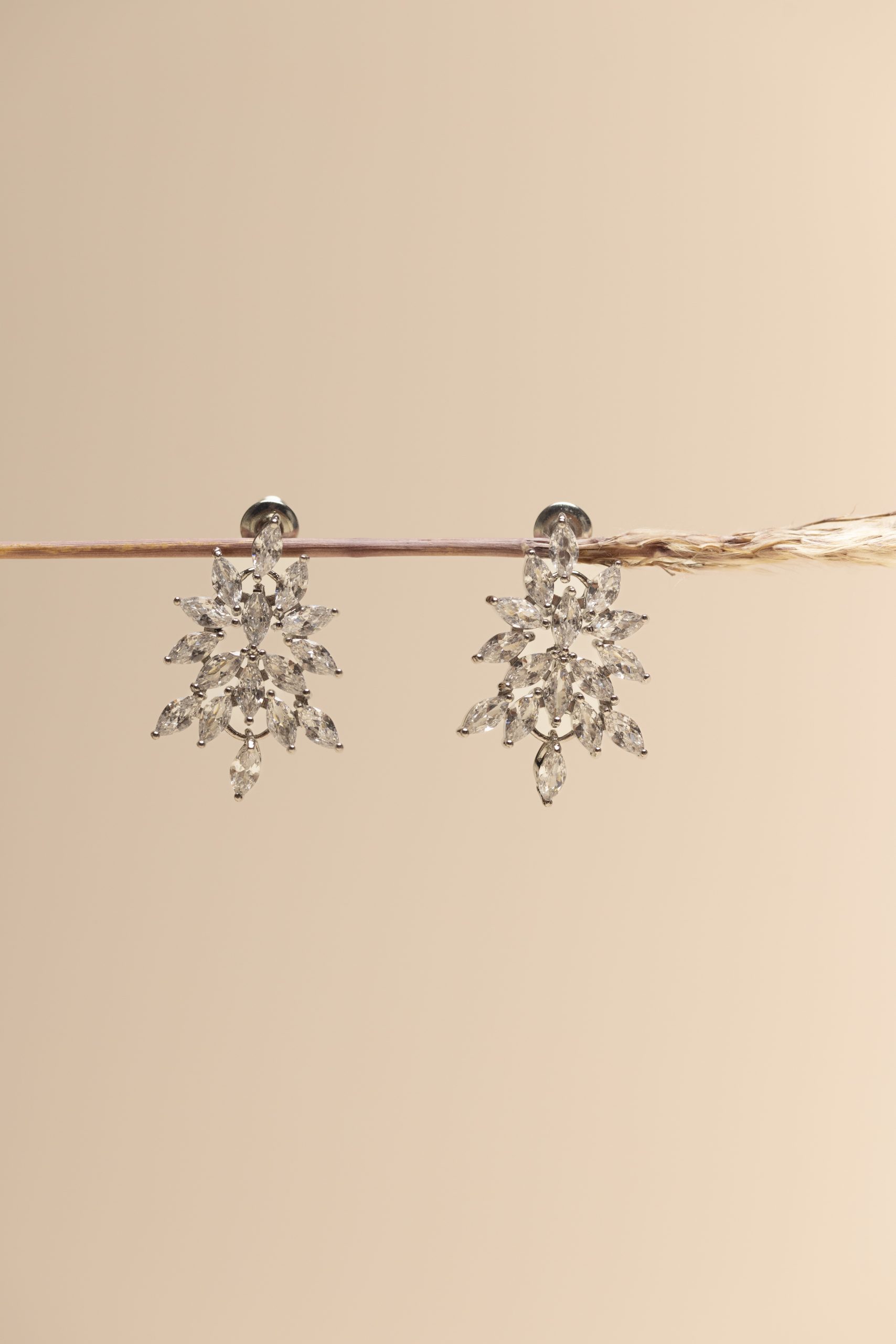 Earrings: The earrings are cluster-style, shaped like a blossoming flower with marquise and pear-cut stones arranged to form layered petals. Their design gives a radiant, three dimensional sparkle, making them bold yet elegant statement pieces.