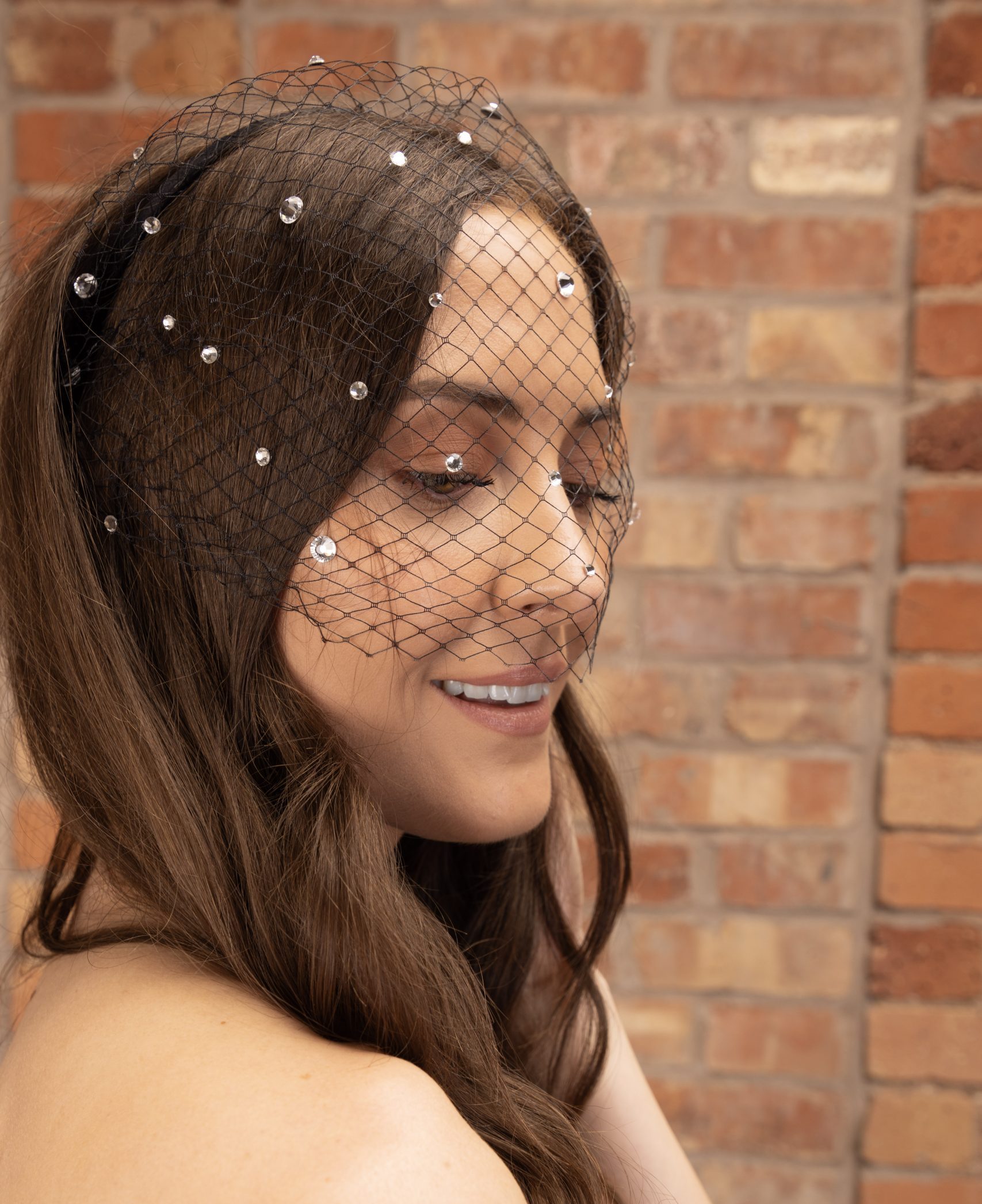 Complete your bridal ensemble with our elegant PBB4011 black birdcage veil. Crafted from delicate wide black netting attached to a slim black headband, this veil cascades gracefully across the face for a timeless, romantic look. Embellished with mixed-size crystals, it adds a sparkling finishing touch that enhances your wedding day look with subtle sophistication.