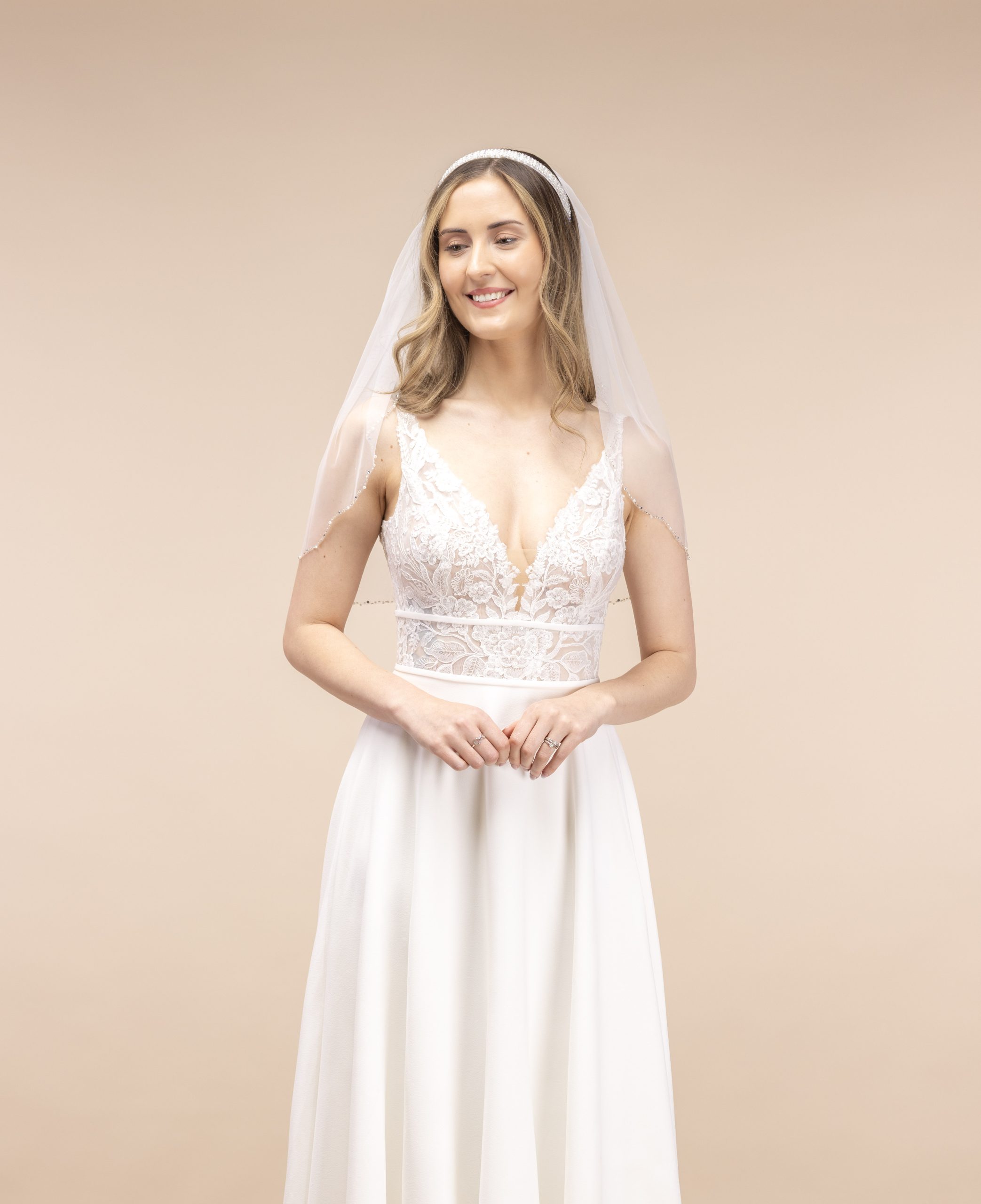 This stunning single tiered soft ivory tulle design features a pearl and heat seal diamante edge.