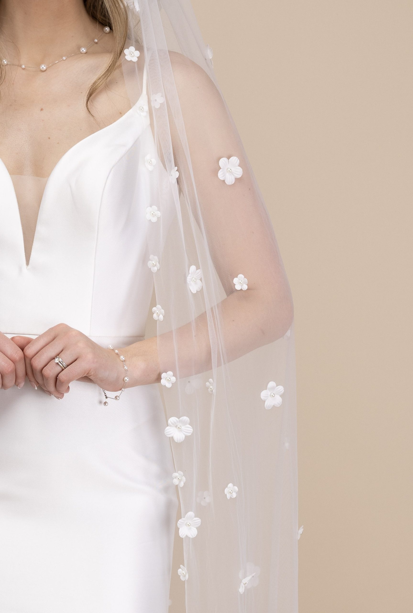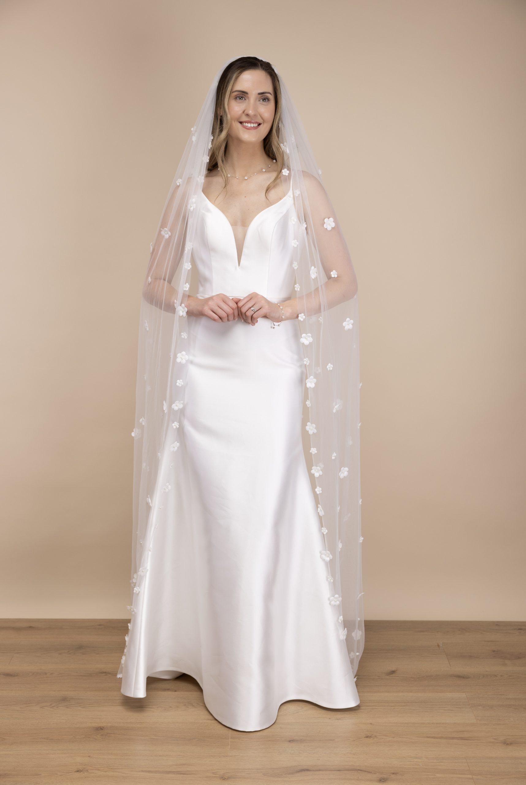 A really pretty veil, this design is single tiered in our super soft ivory tulle, delicately scattered with embossed 3D flowers and petals.