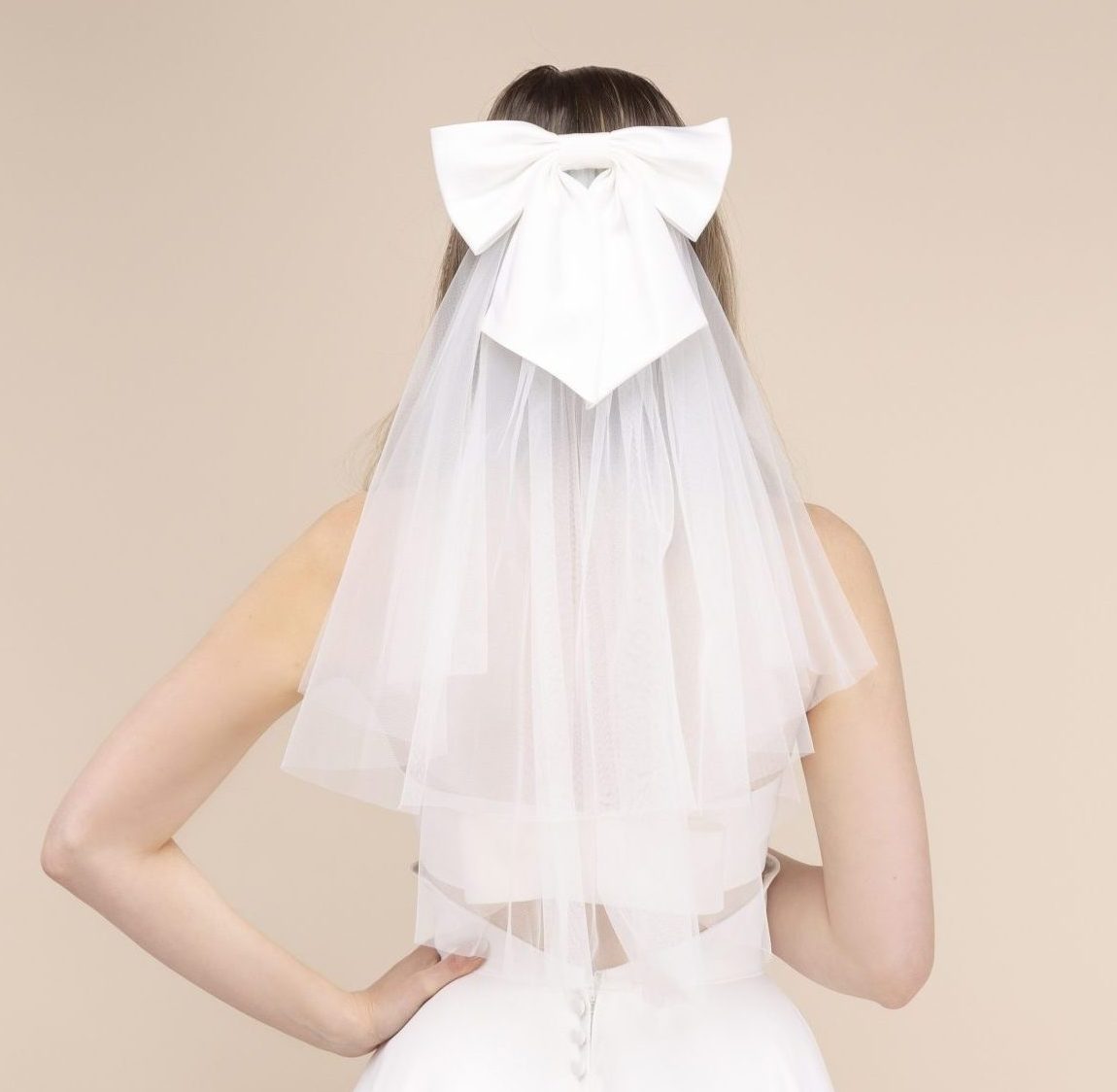 Fun, flirty and perfect for the modern bride! Made from two layers of soft ivory tulle and adorned with a large ivory satin bow at the comb. Whether you’re having a chic city wedding, or looking for a second veil to change in to for the evening, this short veil is a gorgeous choice.